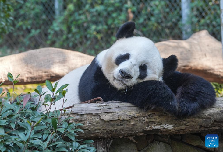 En el zoológico de vida silvestre del centro turístico de Tangshan, en Nanjing, en la provincia de Jiangsu, en el este de China, siete pandas gigantes, todos ellos huéspedes del Centro de Conservación e Investigación de Pandas Gigantes de China, han atraído miles de miradas mientras disfrutaban de la comida y el sol en público en un cálido día de invierno.